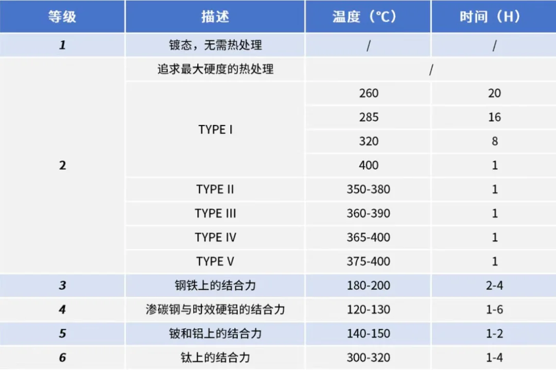 如果化学镀镍层在260℃以上的含氧气氛中进行烘烤,那么镀层会在不同的温度下呈现不同的颜色,从350℃到950℃,镀层会随着温度的提高呈现出黄色、蓝色、绿色、灰色及黑色。此外,化学镀镍层可以进行高温烘烤后处理的方式以提高镀层与基材的结合力及提高镀层的硬度,具体分为以下六个等级: