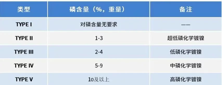 化学镀镍的药水中因为有次亚磷酸盐的存在,形成的是镍磷合金镀层。根据ASTMB733标准规范,不同类型的镀层中磷含量的要求是不同的,具体分为上面表格中的五种类型。