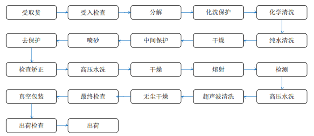 通常采用酸洗、碱洗、有机溶剂清洗等方法,清洗过后的产品干燥后,再次检查其品质,合格的产品到无尘室进行包装即可。