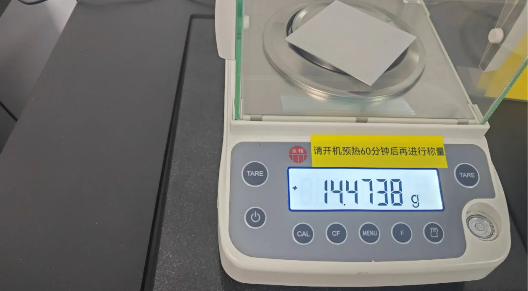 膜层测试的试片最小尺寸应为3*3*0.032英寸,且测试用的试片不得进行染色和封孔。在测试前,试片表面应用无纺布擦拭干净,擦拭干净后放入烤箱用93℃±6℃的温度烘烤至少30min;烤完后放置至冷却,然后使用天平进行称重并记录数据(如果是硬质阳极氧化,则还需记录膜层的厚度)。
