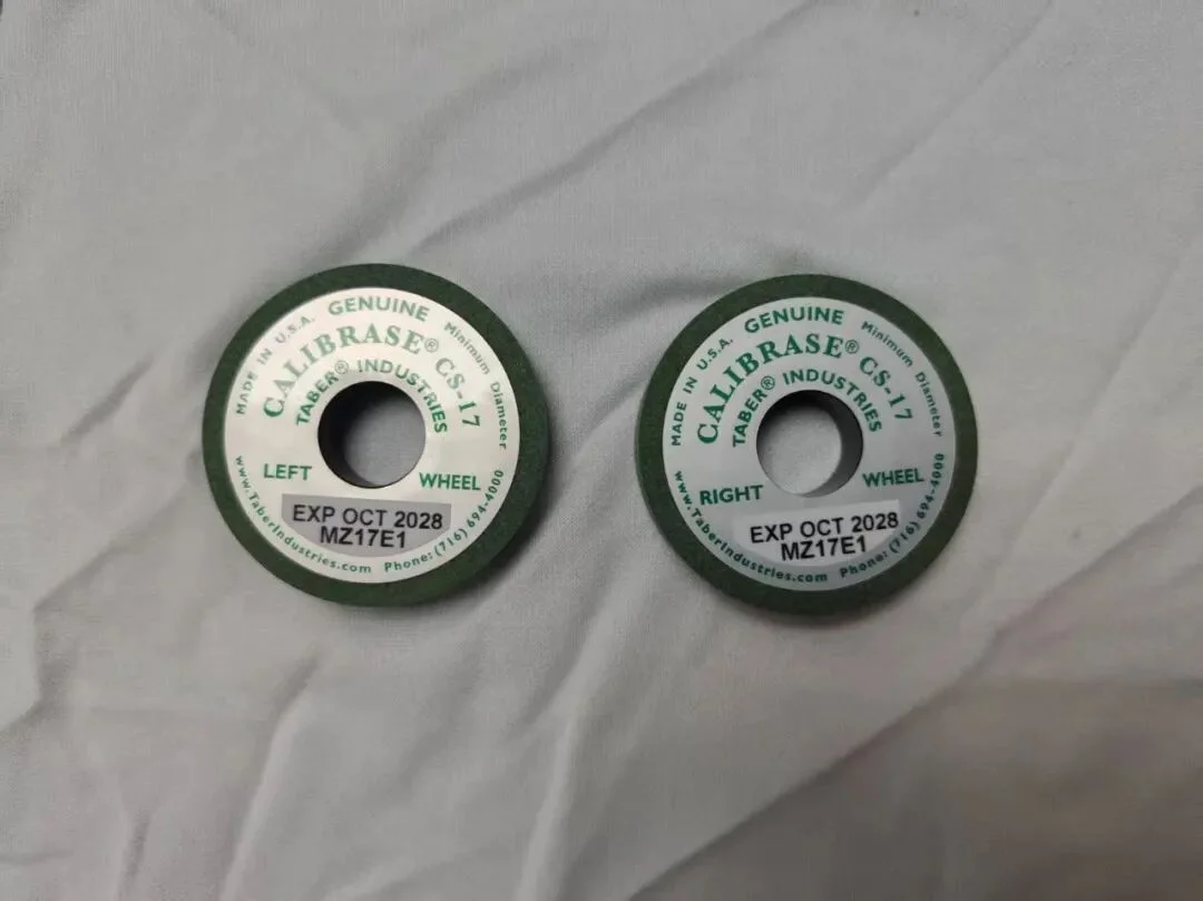 在正式开始对测试前,注意要看一下砂轮(型号需为CS-17)是否在使用期限内且尺寸在以及砂轮左右是否安装正确;确认无误后使用S-11砂纸对砂轮进行修整(每10000转需进行一次修整),修整完成后将试样安装在耐磨机上,固定好真空吸嘴(吸嘴需在试样上方3mm±1mm)并保证吸嘴的吸力在13.7kPa以上,然后让砂轮在膜层上以每分钟70转(RPM)的速度旋转10000次。旋转完成后将试样表面清洁干净并称重。