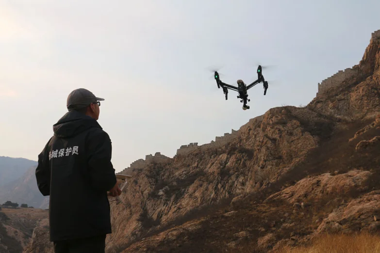 ▲河北省秦皇岛市山海关区长城保护员张鹏用无人机巡查长城