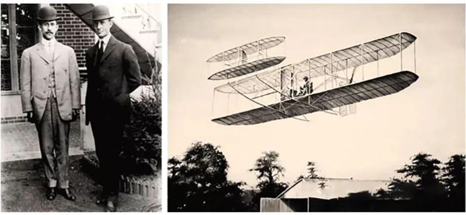 ▲莱特兄弟及其发明的“飞行者一号”