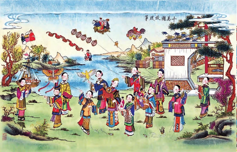 ▲十美图放风筝,天津杨柳青年画店创作的年画作