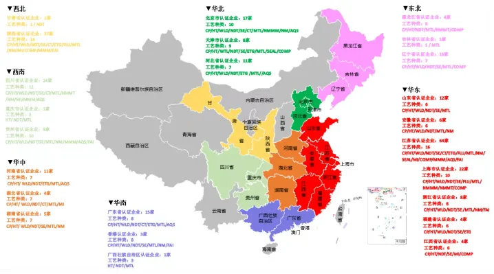 中国境内拥有 Nadcap 认证企业合计282家,涵盖央企、地方国企、民营企业、高校科技研究机构、合资企业等;地域分布在东北、西北、西南、华北、华中、华东、华南,其中华东为制造重镇。国内拥有量前五的认证资质为无损检测 NDT(163 家)、热处理 HT(136家)、化学处理 CP(101 家)、材料实验室 MTL(76 家)、焊接 WLD(41 家)。