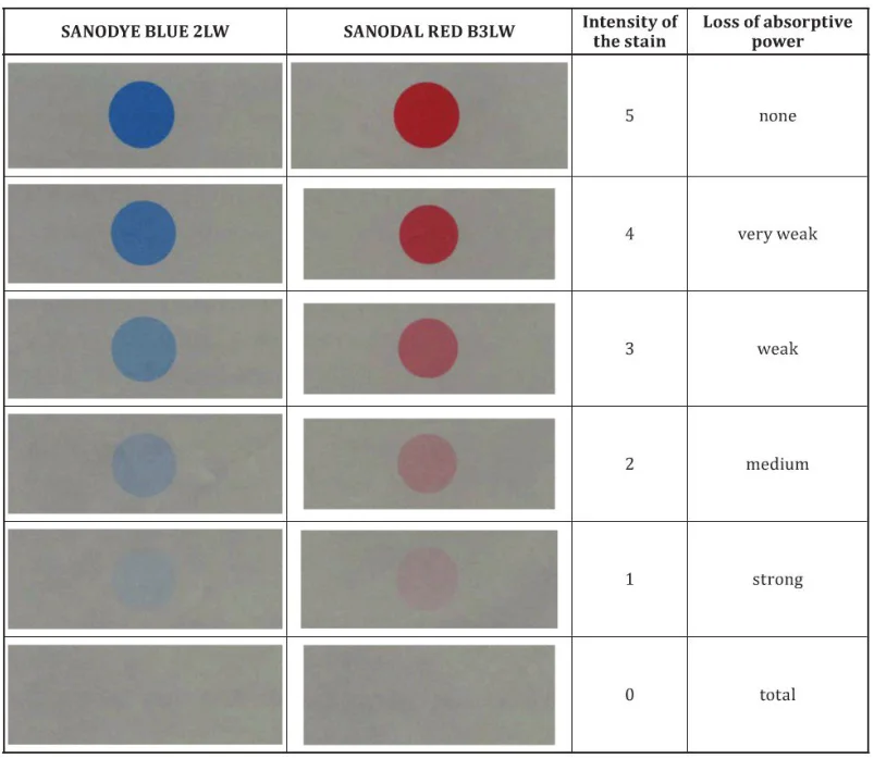如果使用的染料为Sanodye Blue 2LW或 Sanodal Red B3LW,则可参照上图判断试样膜层的封孔性能(也可通过使用色差仪测定试样染色前后的色差值来判断膜层封孔性能)。