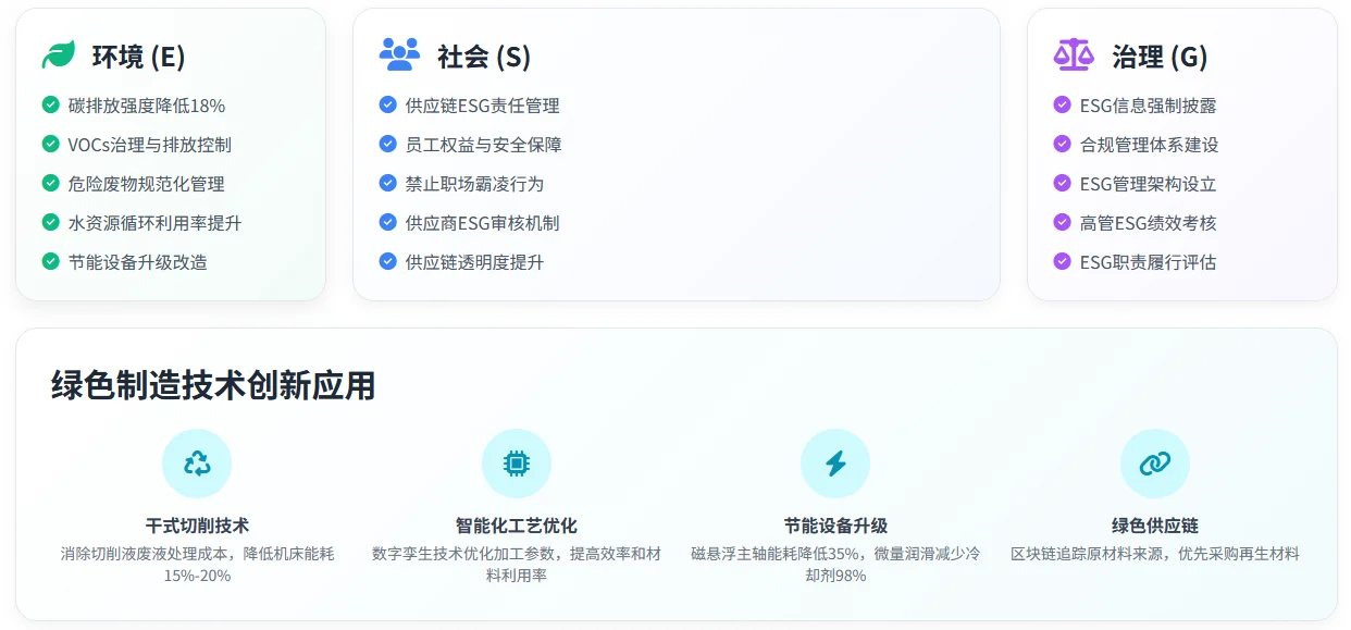 运营端:ESG优化可实现降本与风控双重价值。从实际运营来看,ESG管理与企业成本控制、风险防控存在天然协同性。环境维度上,余热回收、切削液循环利用等技术的应用,能直接减少能耗与耗材支出;社会维度上,加强员工安全培训与人文关怀,可降低工伤事故率及人员流失成本;治理维度上,合规的操作流程与财务透明机制,能有效规避环保处罚、劳资纠纷等潜在风险,提升企业经营稳定性。